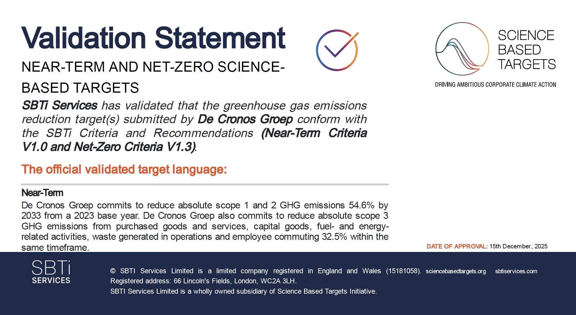 De Belgische Cronos Groep telt ruim 9.000 medewerkers. Het bedrijf kent al een kwarteeuw duurzame groei en haalde in 2022 een geconsolideerde jaaromzet van 1,1 miljard euro. Naast het hoofdkwartier in Kontich (Antwerpen) telt de groep ook belangrijke clusters in Amsterdam, Gent, Leuven, Mechelen en Kortrijk. Meer informatie op https://cronos-groep.be/.
